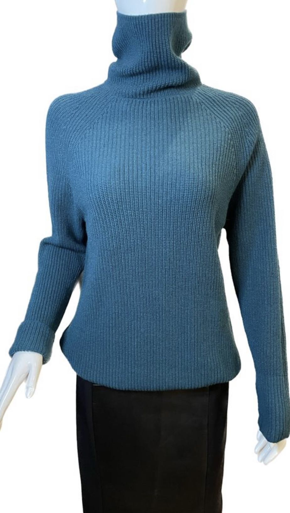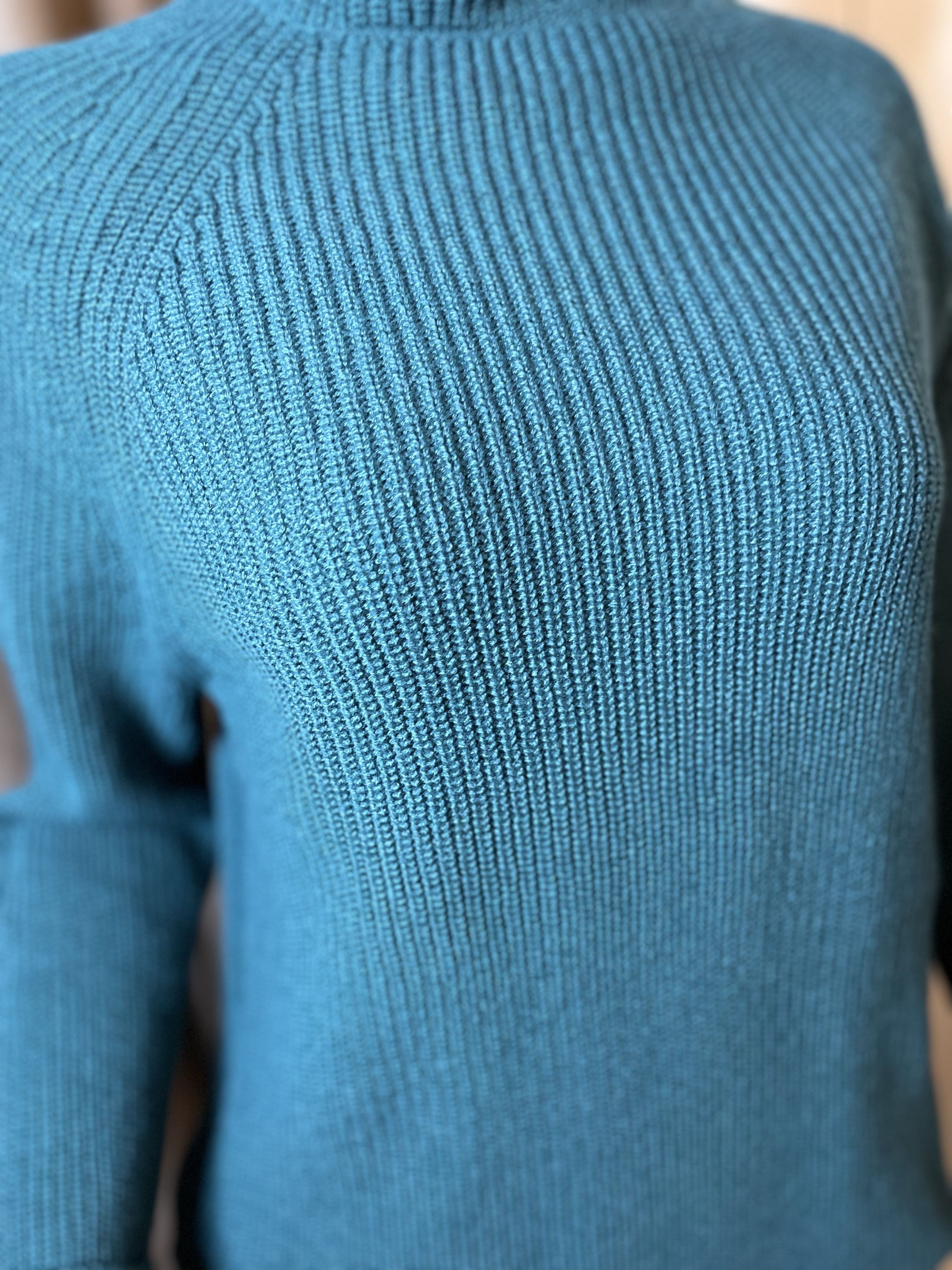 Данный свитер цвета глубокой морской волны имеет размеры: длина изделия — 61 см; ширина изделия — 48 см; длина рукава (дл.плеча +дл.рукава) - 72 см, с манжетом - 65 см.