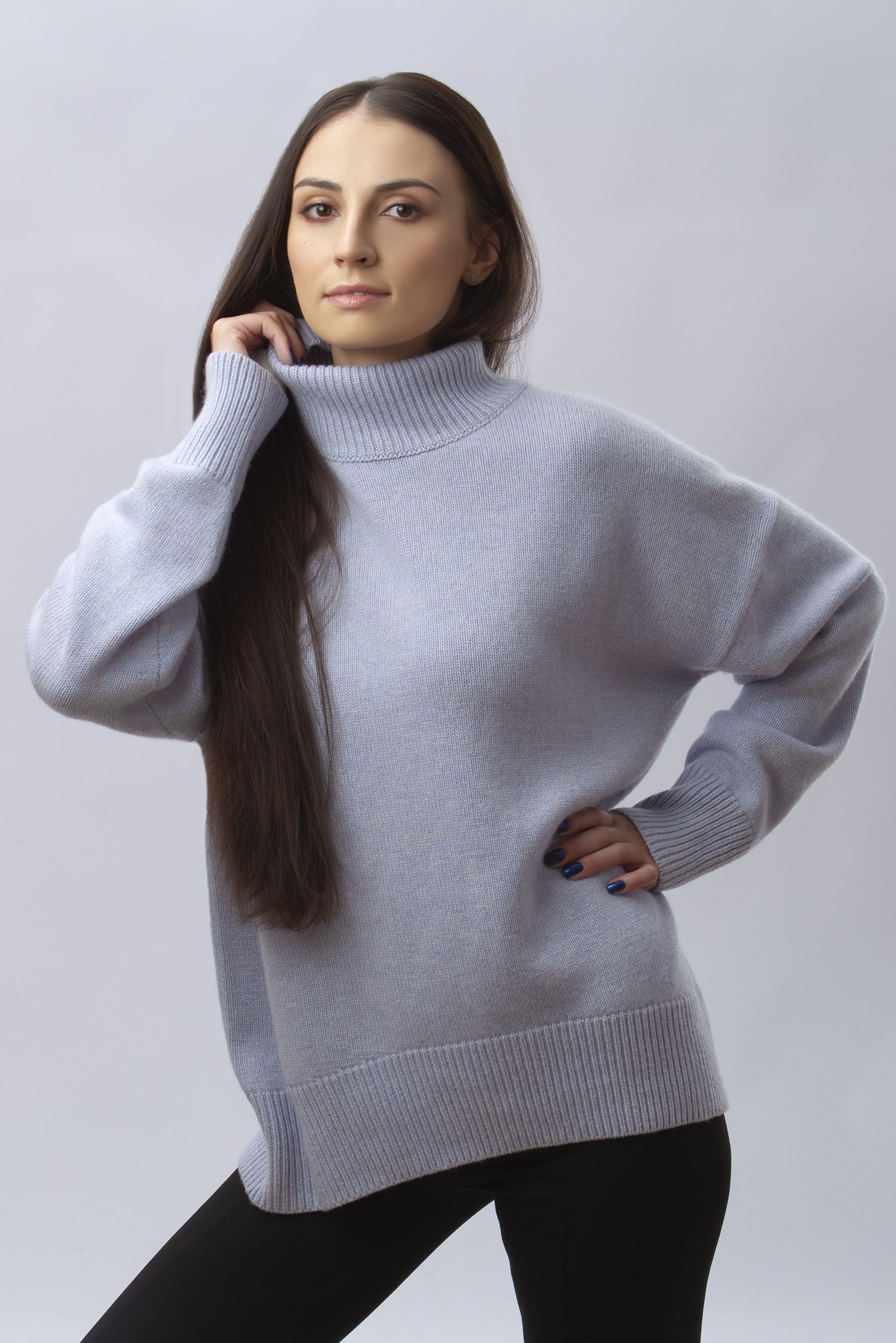 Уютный свитер свободного силуэта со спущенным плечом, высоким воротником-стойкой и с рукавом полной длины. Воротник, низ изделия и рукава оформлены резинками.