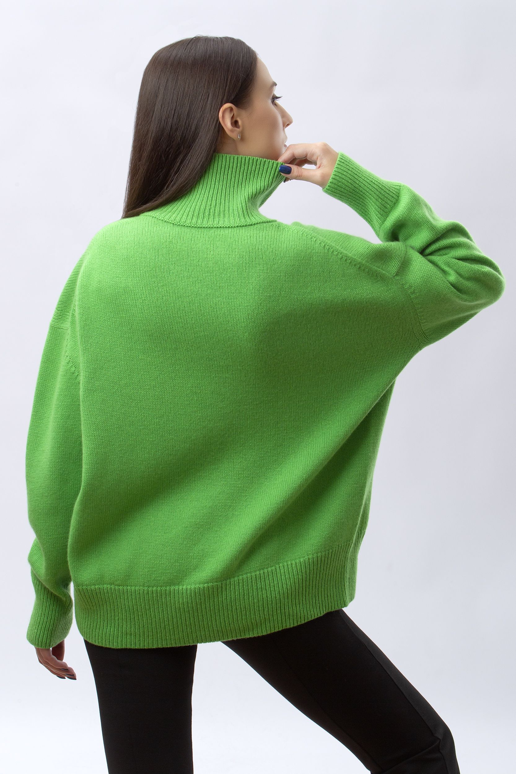 Уютный свитер свободного силуэта со спущенным плечом, высоким воротником-стойкой и с рукавом полной длины. Воротник, низ изделия и рукава оформлены резинками.