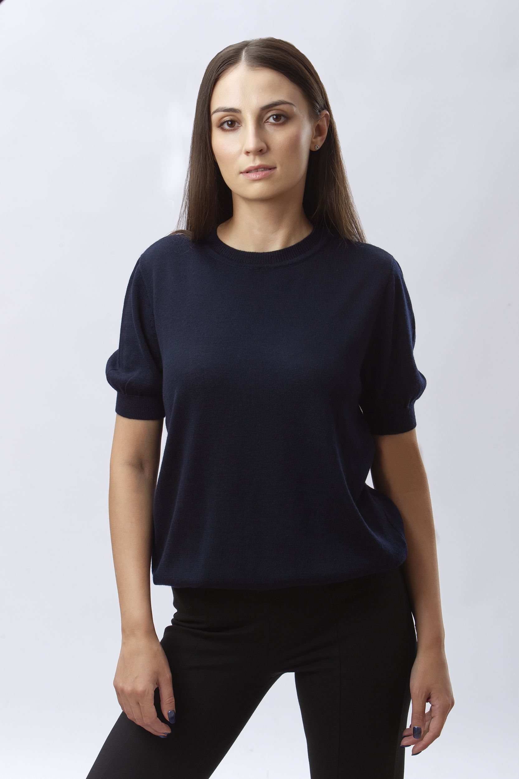 Базовый джемпер с коротким рукавом из пряжи натурального состава: 90% меринос экстра файн, 10% кашемир.